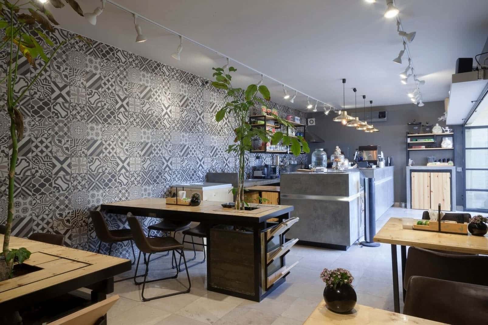 Textures, patterns, and natural finishes play a central role in shaping the identity of Café Distrito. Graphic surfaces and warm metals add character, while wood elements introduce balance and comfort.