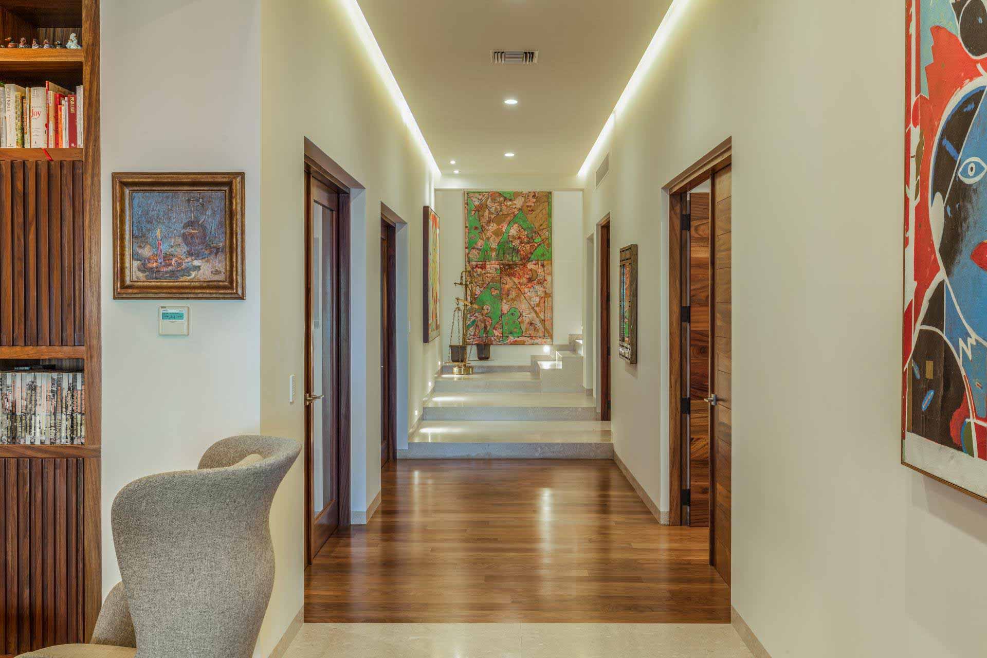 The interior concept is rooted in restraint. Clean lines, balanced compositions, and a neutral palette establish a sense of calm throughout the residence. Each space was conceived to feel open yet grounded, offering moments of pause and continuity as one moves through the home.