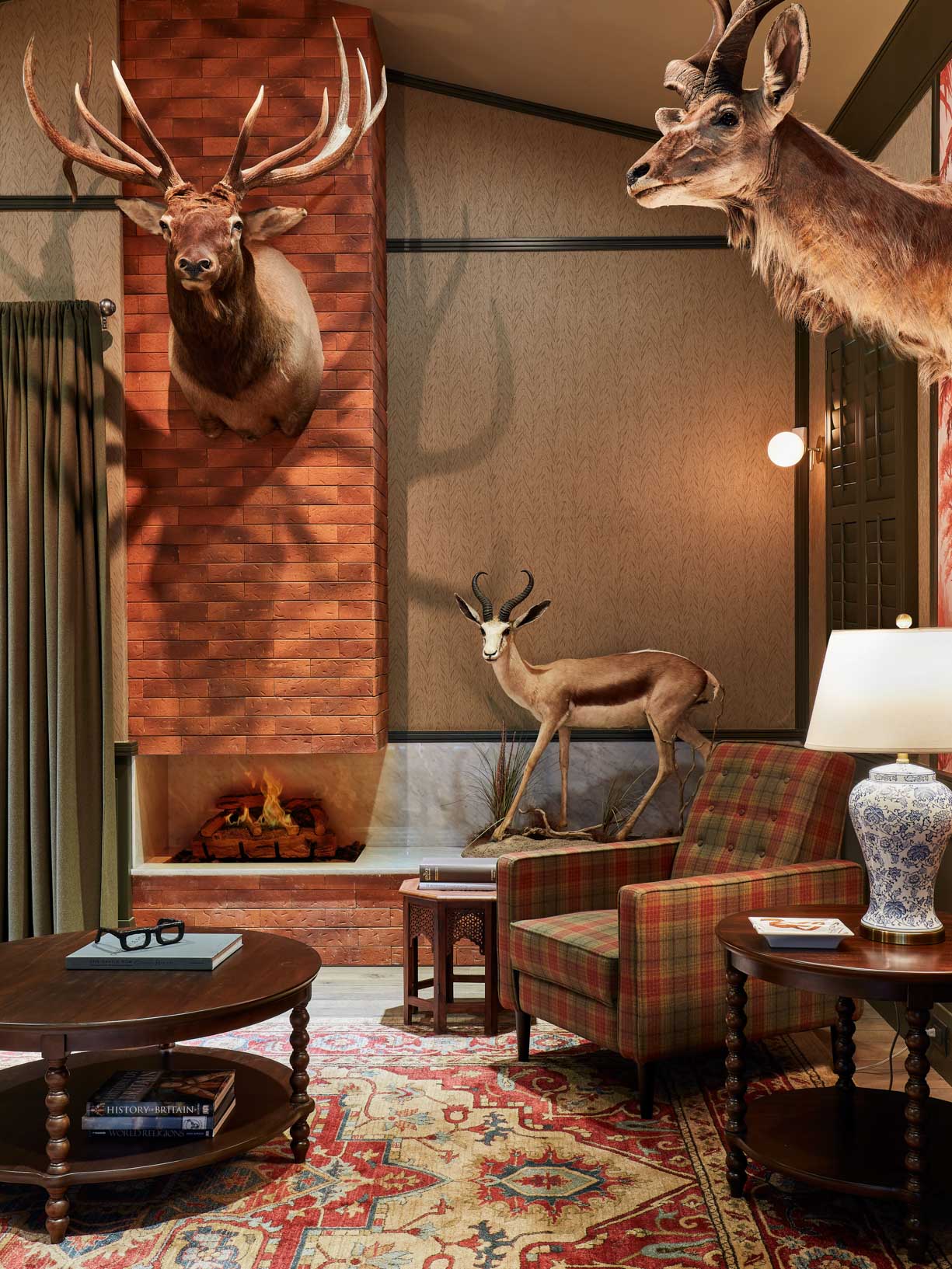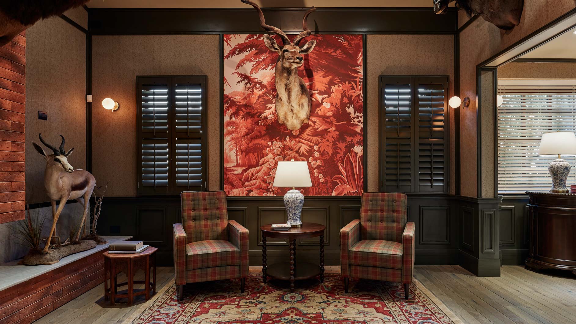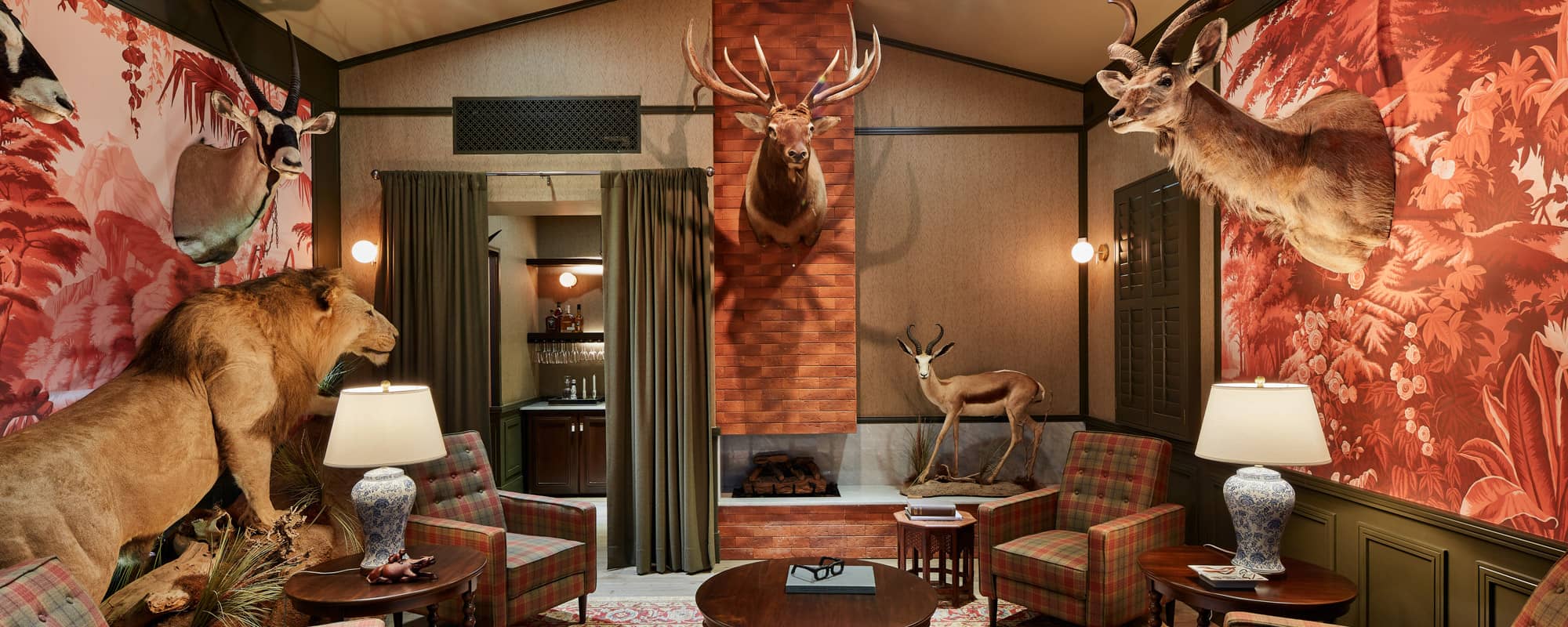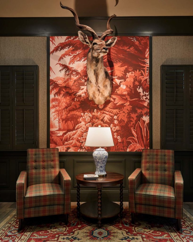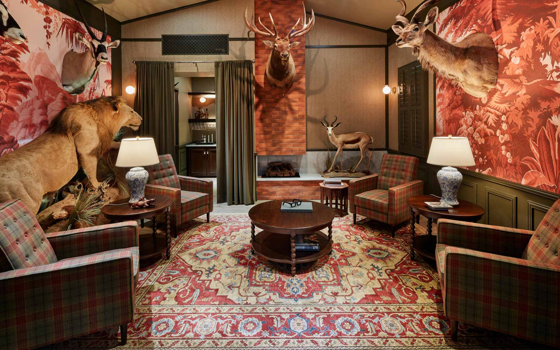 Inspired by classic English club tradition, the space embraces bold wallpaper, tailored upholstery, dark millwork, and curated statement pieces to create a setting that feels both refined and immersive.