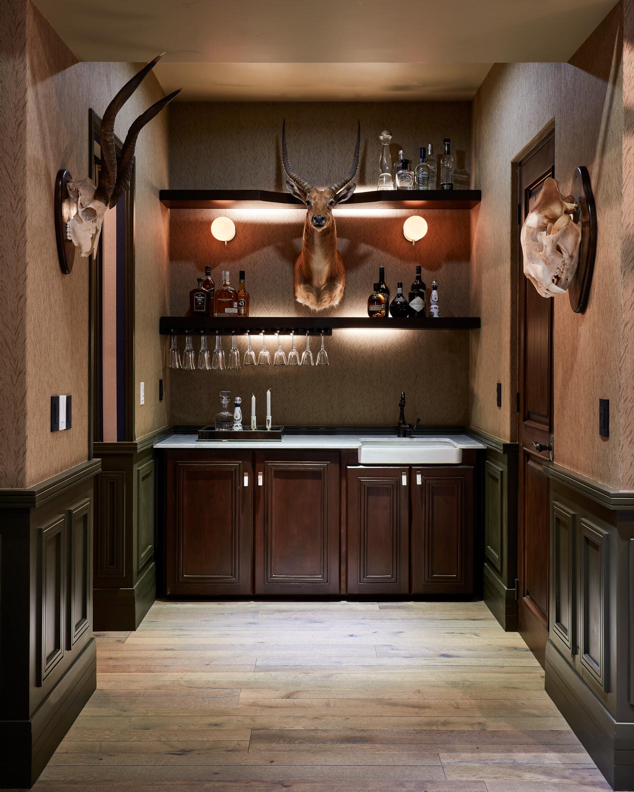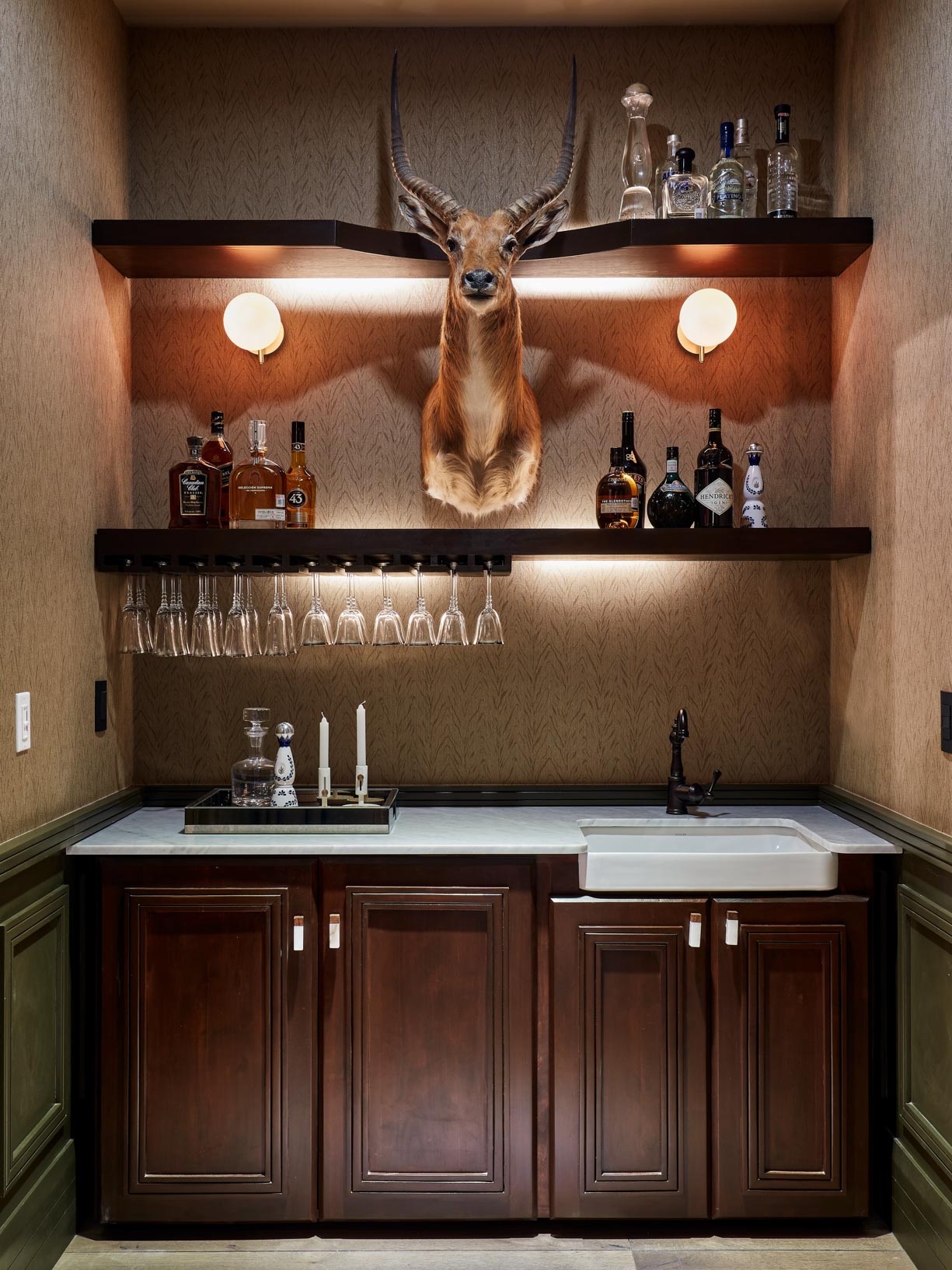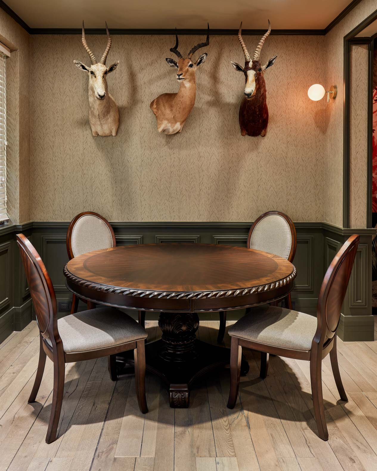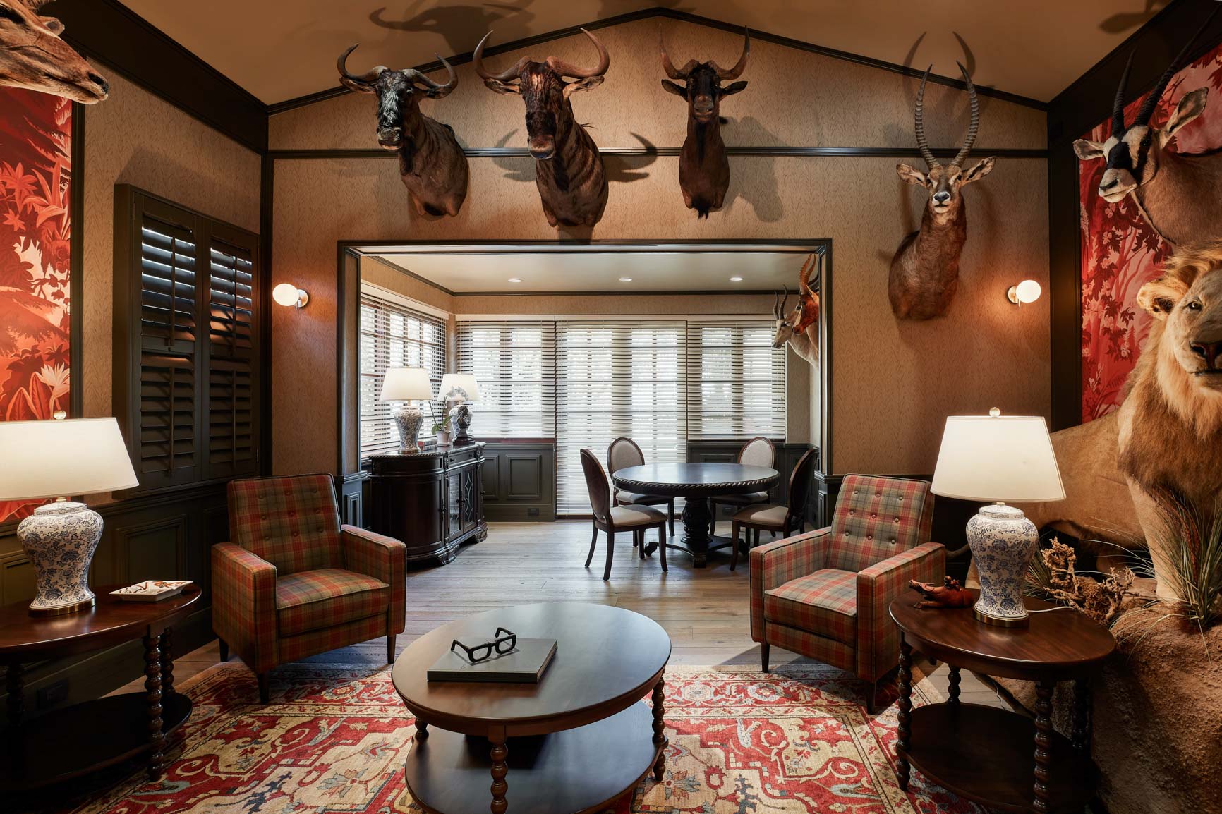 Inspired by classic English club tradition, the space embraces bold wallpaper, tailored upholstery, dark millwork, and curated statement pieces to create a setting that feels both refined and immersive.