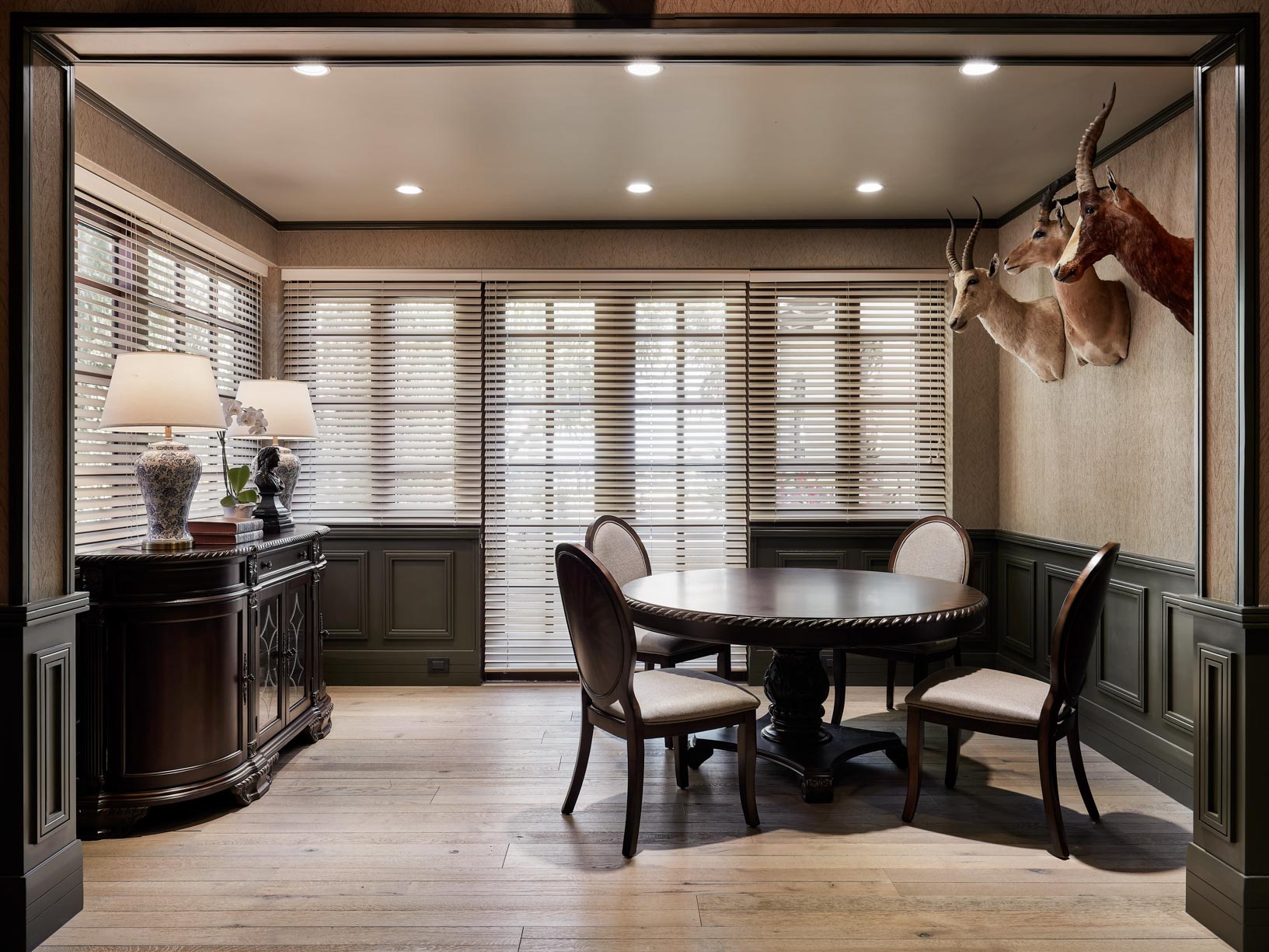The contrast between structured symmetry and expressive detail gives the room its strength — traditional, yet unapologetically bold.