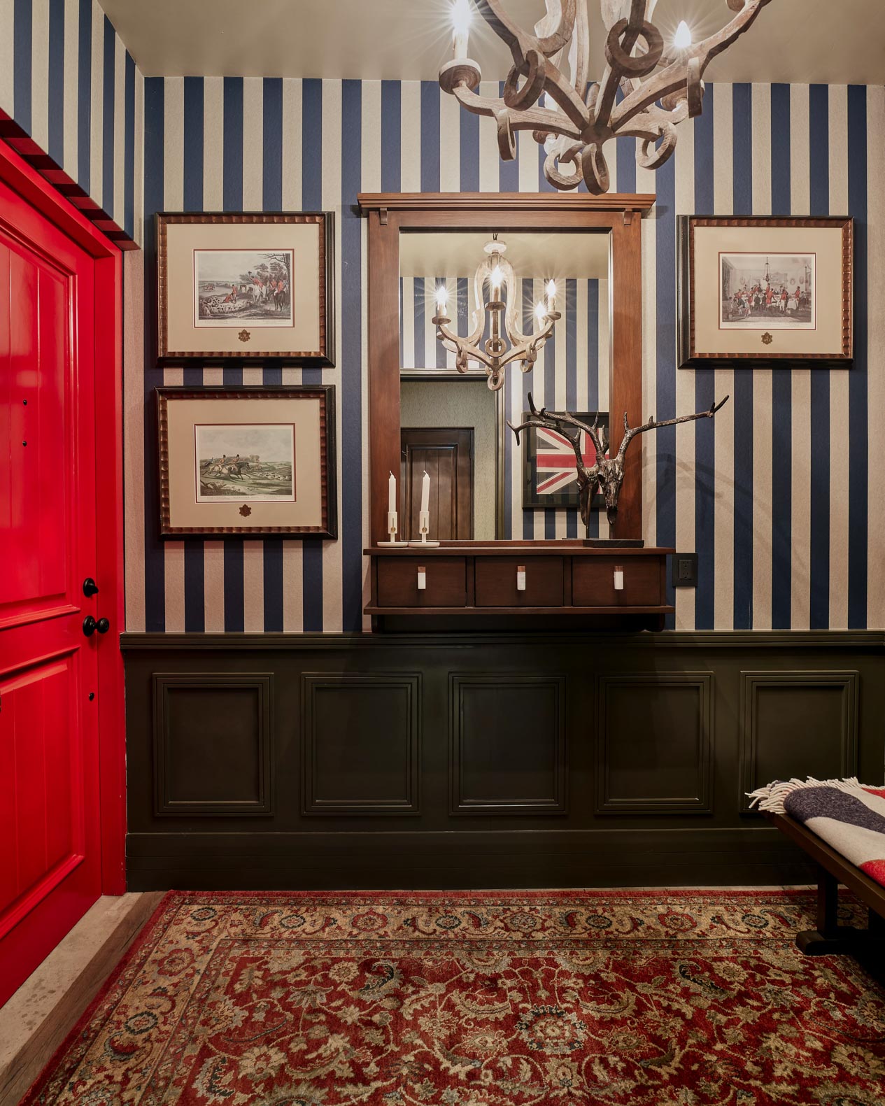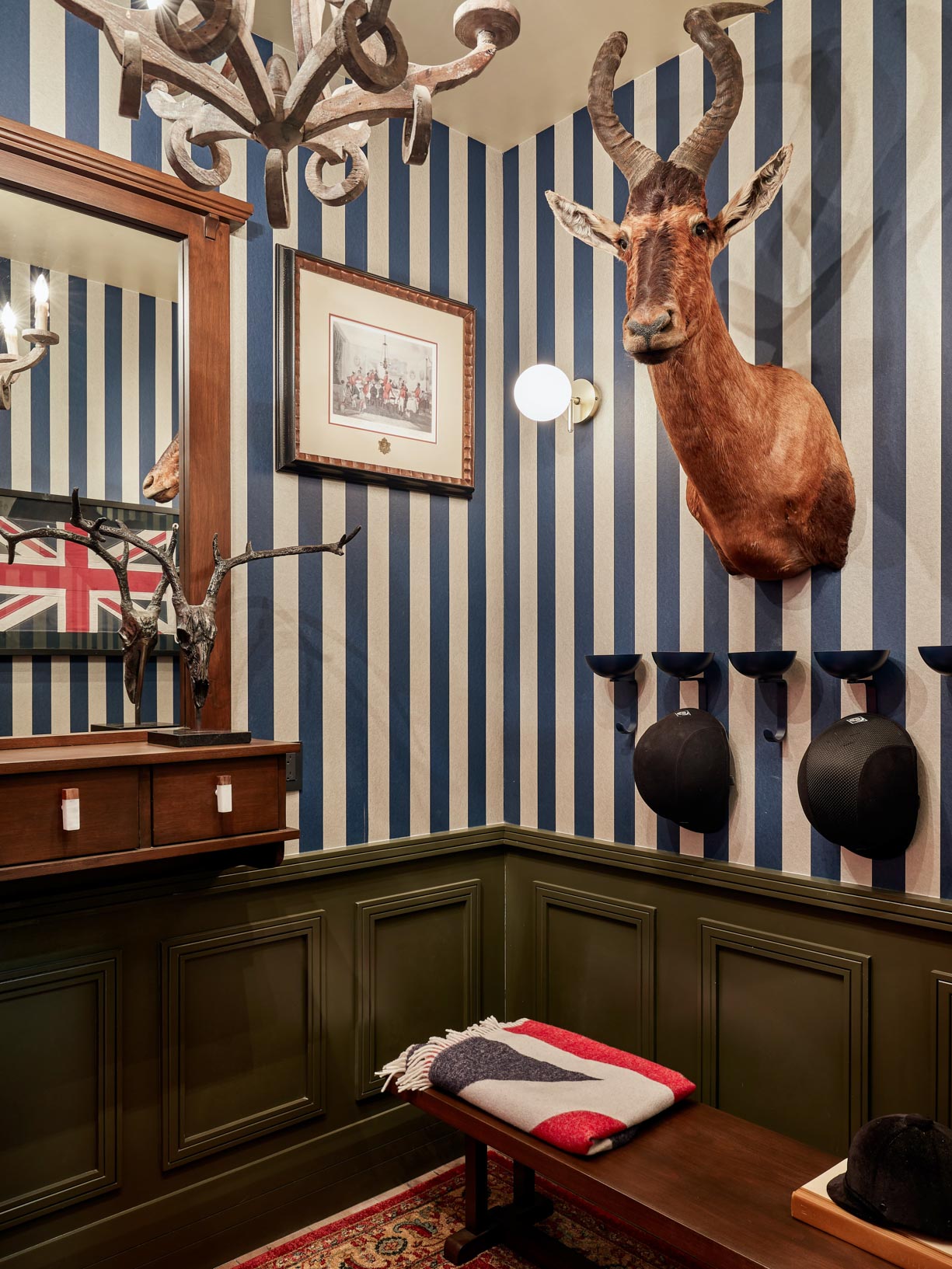 Every element, from the striped walls to the heritage textiles and sculptural lighting, contributes to a narrative of timeless character and cultivated taste.
