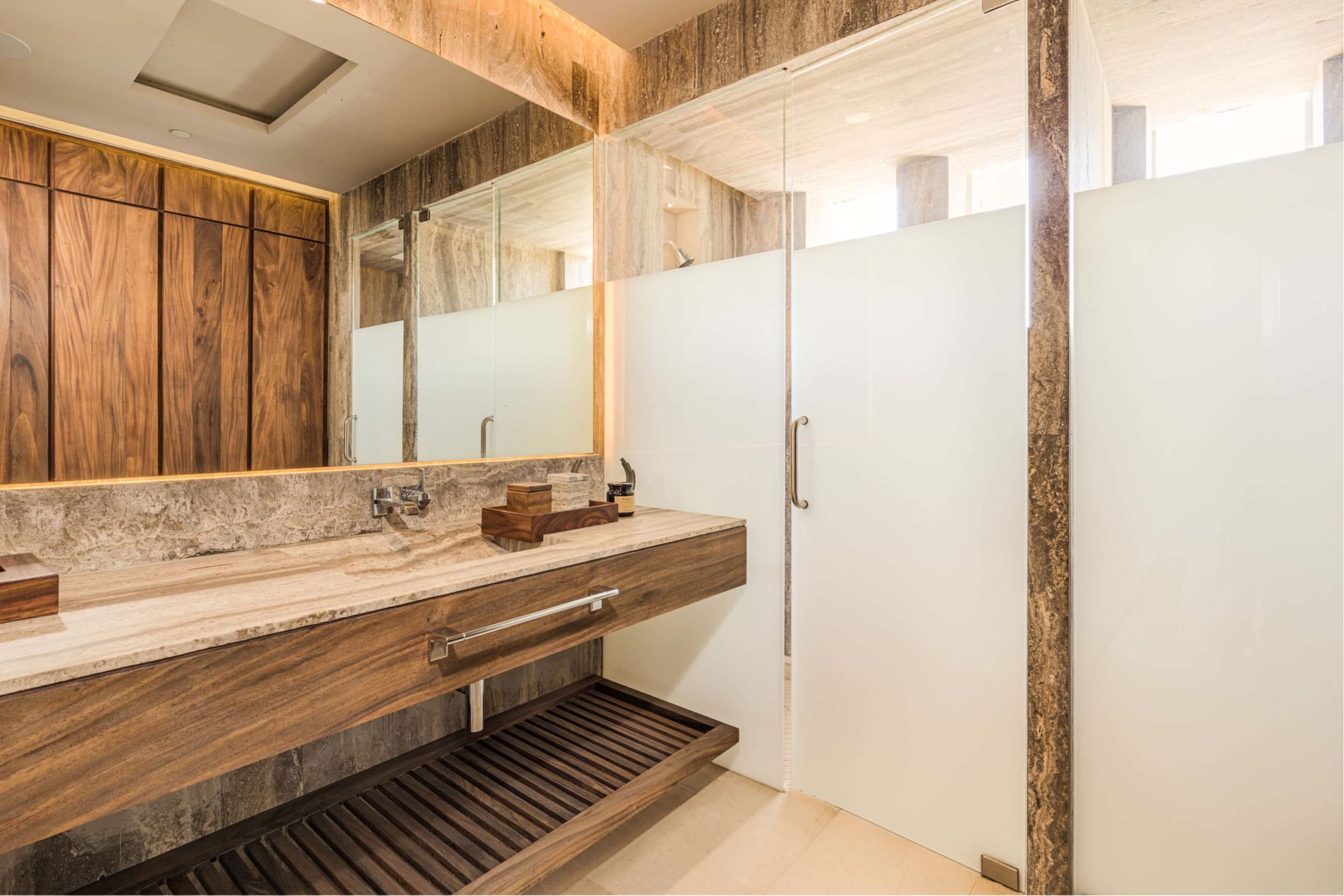 Stone surfaces in bathrooms and kitchens provide balance — cool, tactile, and refined. The contrast between organic textures and clean architectural lines defines the spatial identity of the project.