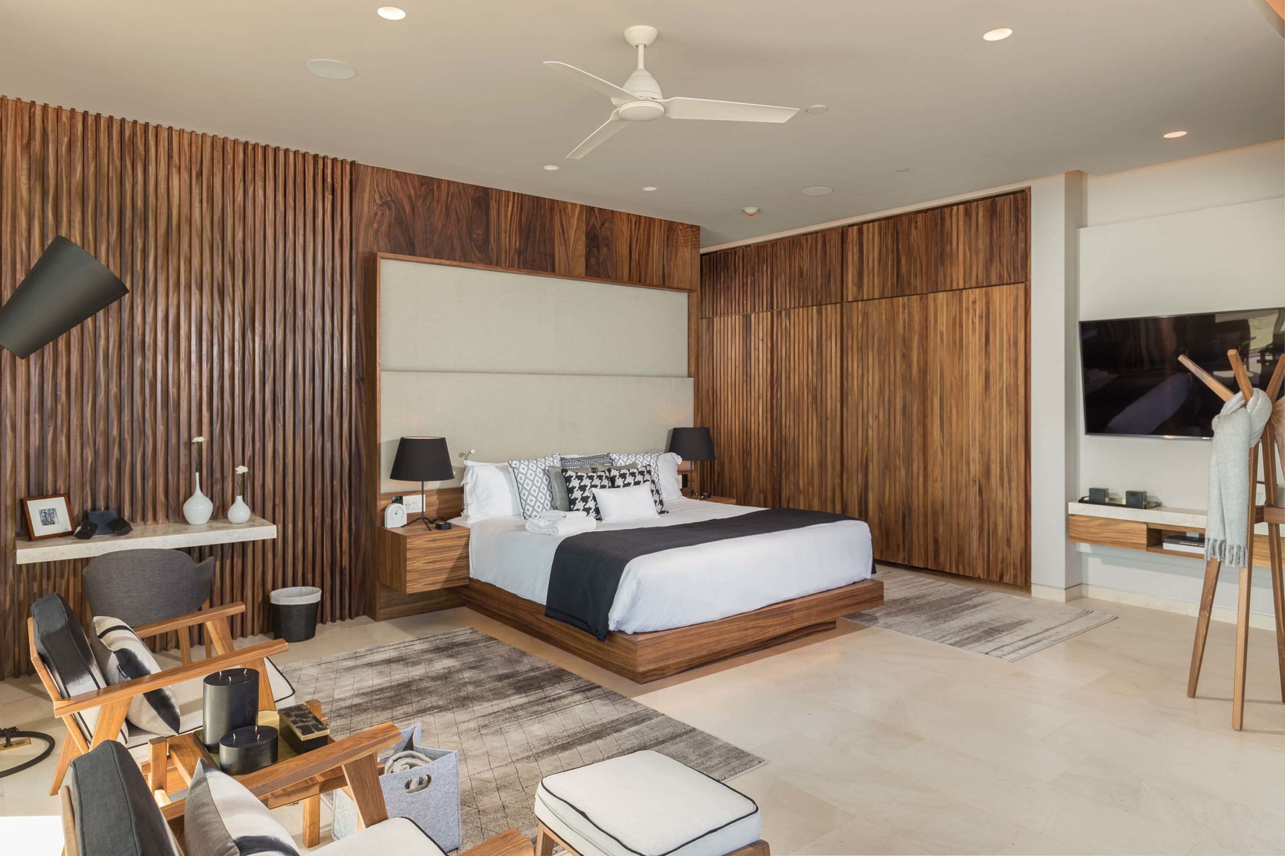 Natural wood introduces depth and rhythm across bedrooms and living areas. Vertical paneling, custom millwork, and subtle grain patterns add warmth without visual weight.