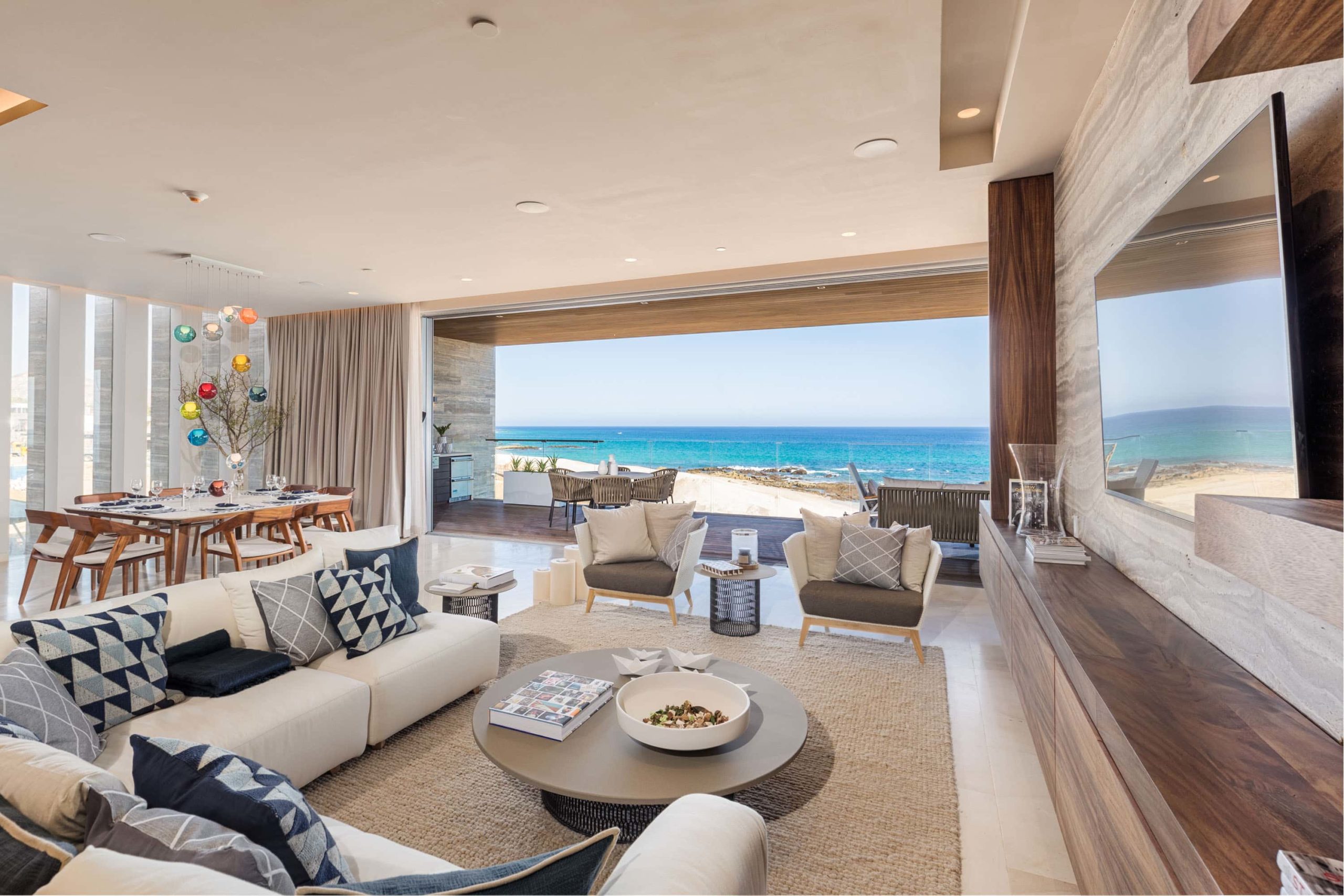 Expansive openings dissolve boundaries between interior and terrace, allowing the horizon to become part of daily life. Soft textiles, neutral palettes, and carefully selected furnishings create an environment that feels calm, grounded, and naturally luminous.