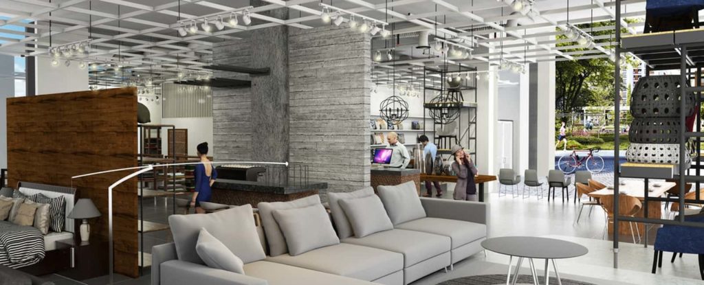 A restrained combination of wood, concrete textures, metal accents, and neutral surfaces defines the atmosphere. Warm timber volumes contrast with industrial ceilings, balancing sophistication with approachability.