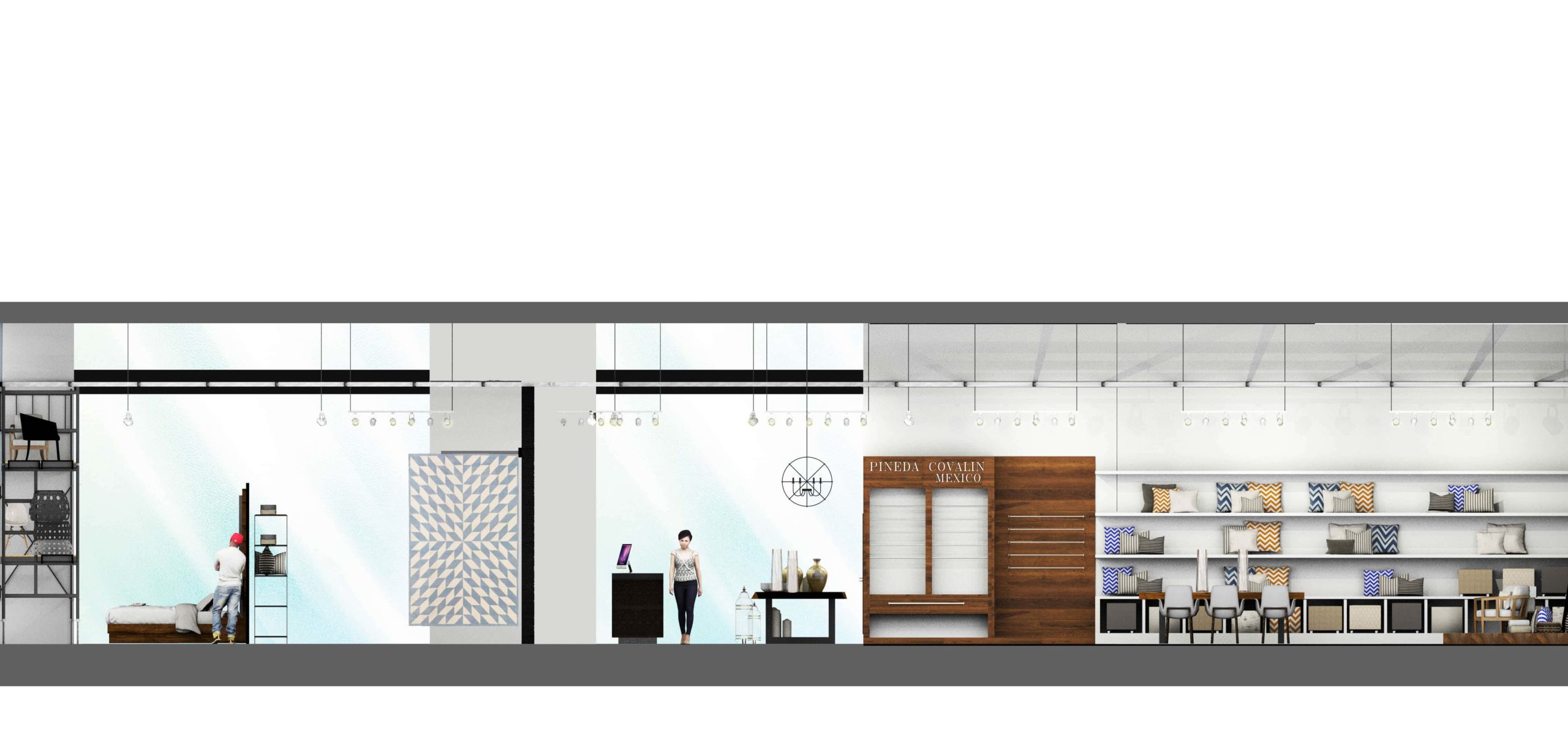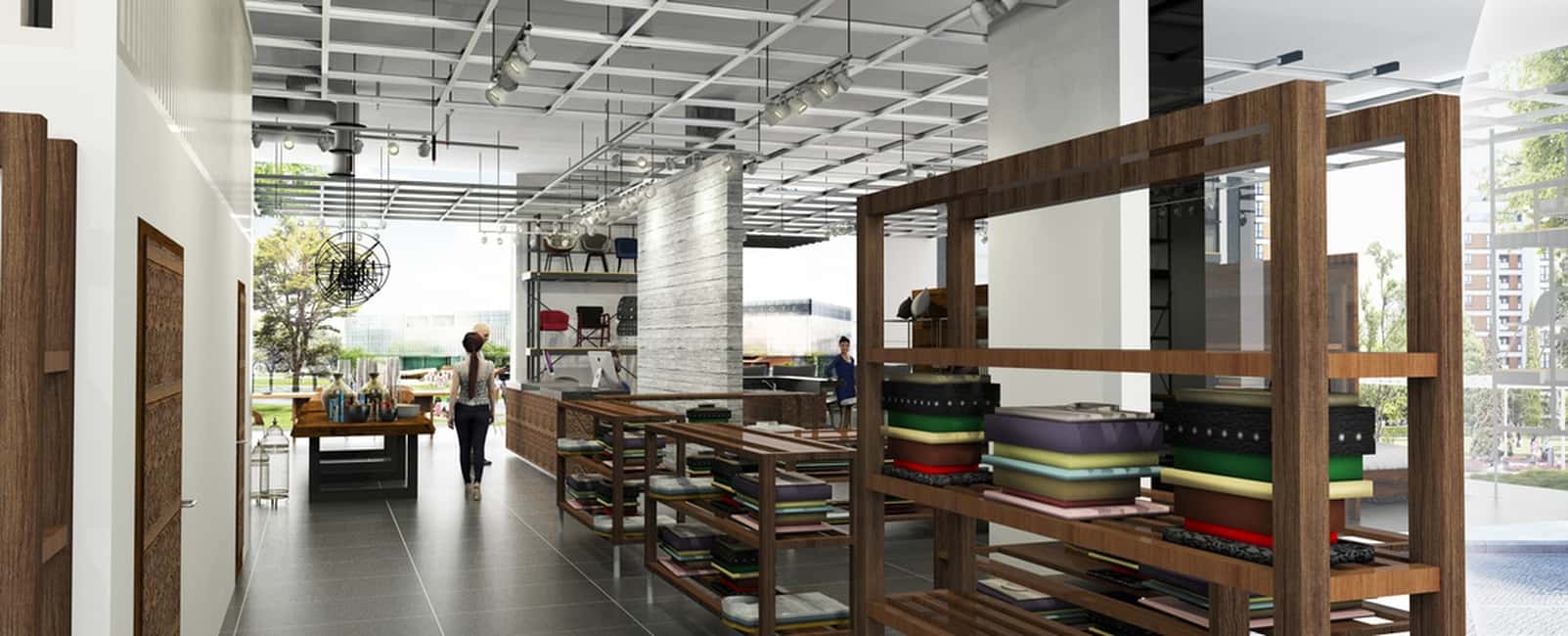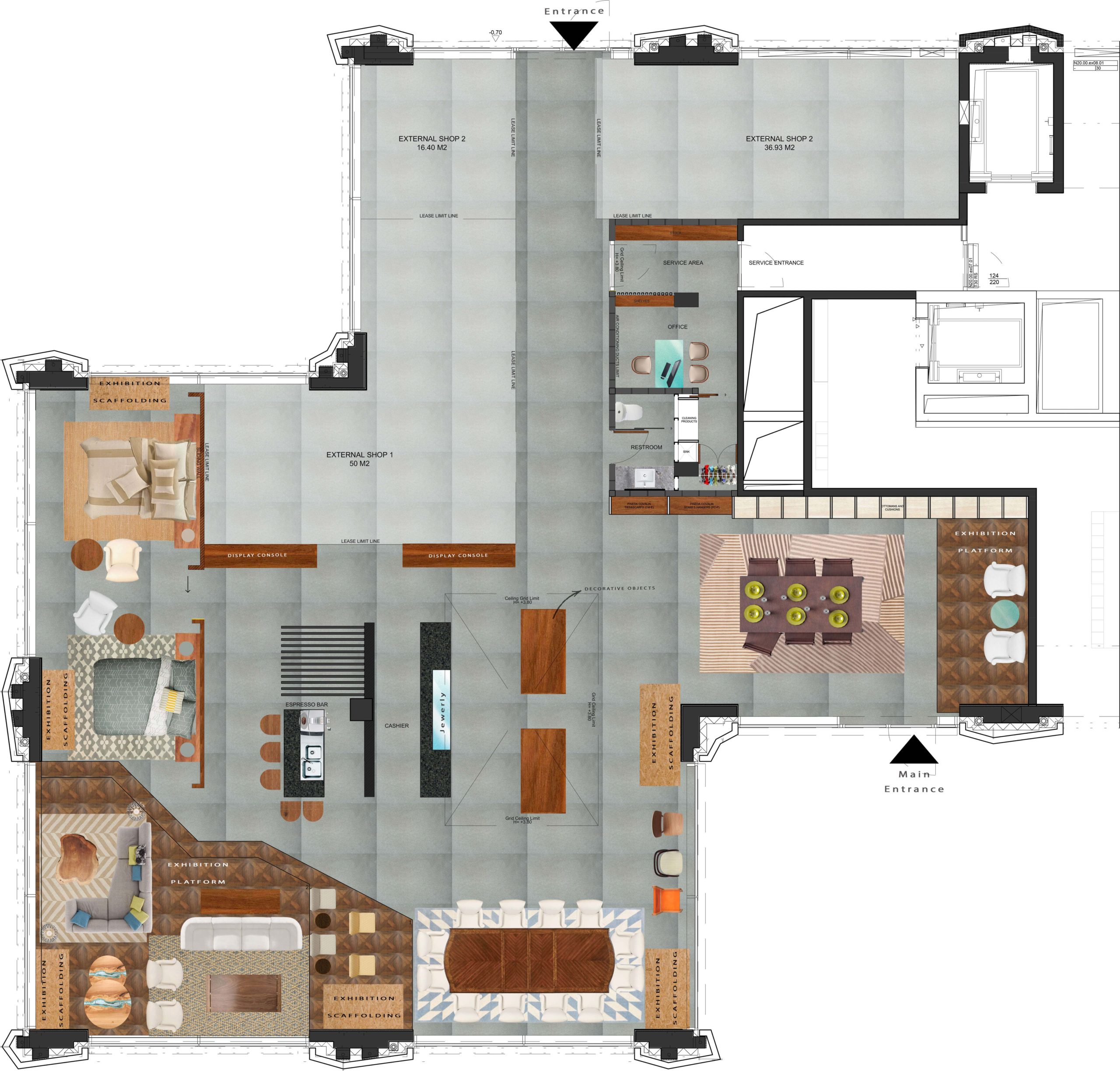 The layout emphasizes fluid circulation and visual transparency. Architectural elements—columns, suspended lighting grids, and linear partitions—organize the space without overwhelming it. Display zones remain adaptable, allowing the interior to evolve with changing collections.