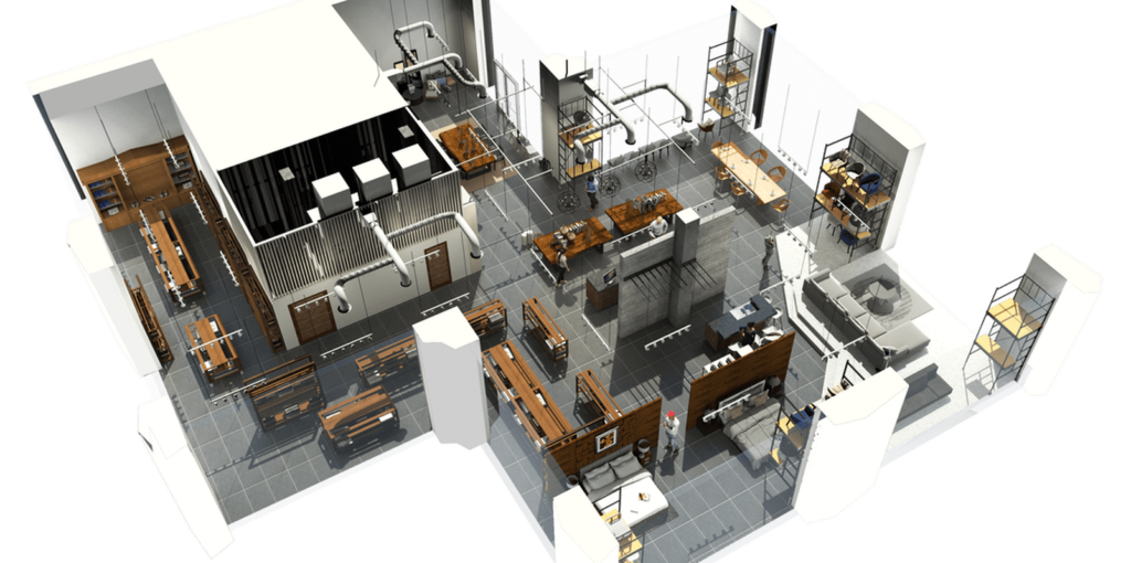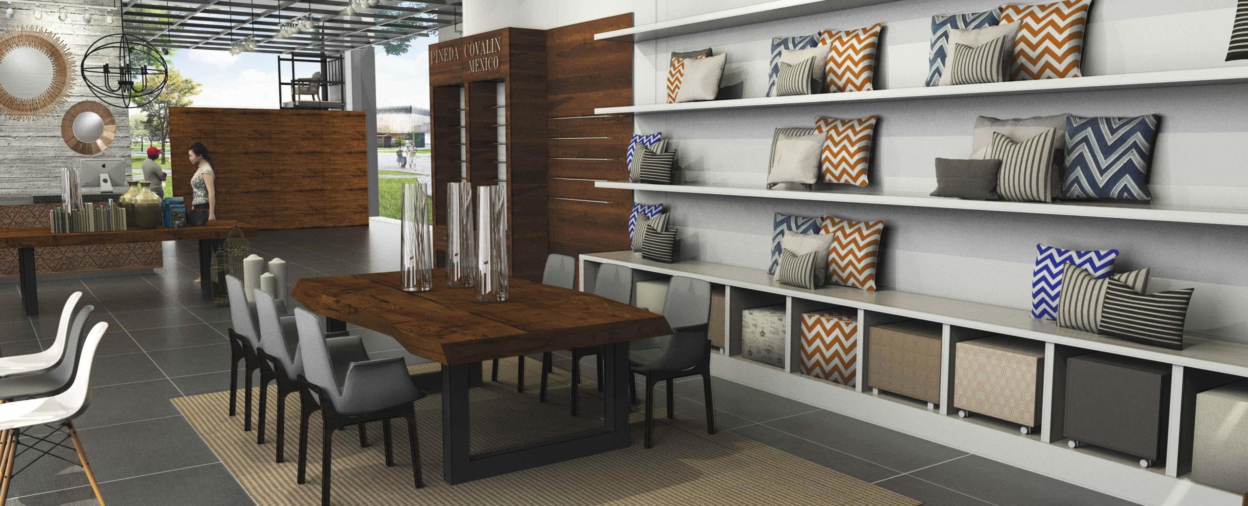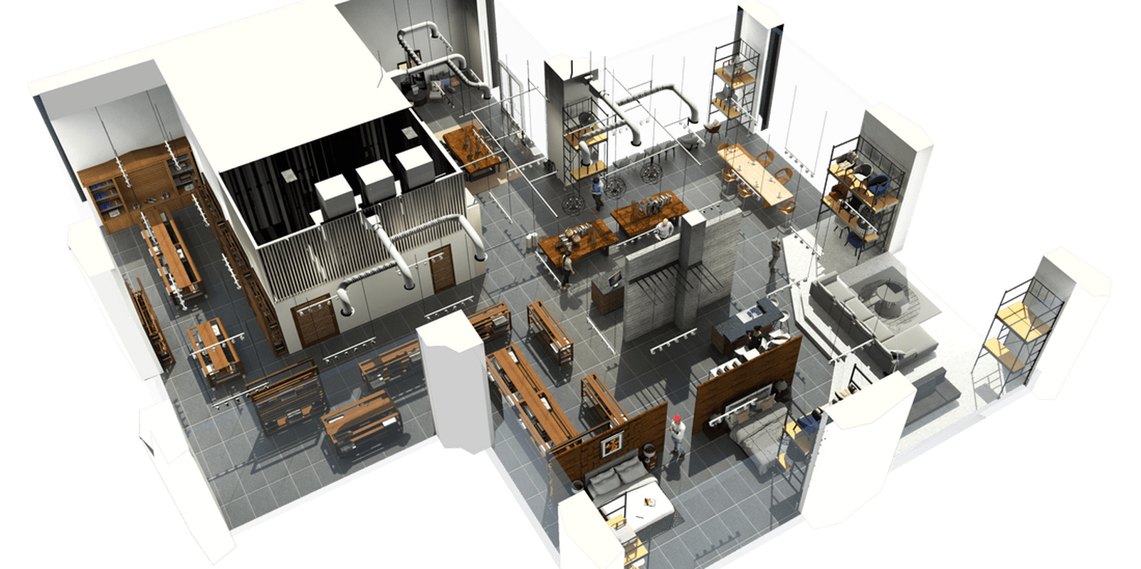 The layout emphasizes fluid circulation and visual transparency. Architectural elements—columns, suspended lighting grids, and linear partitions—organize the space without overwhelming it. Display zones remain adaptable, allowing the interior to evolve with changing collections.