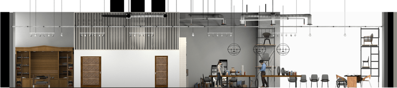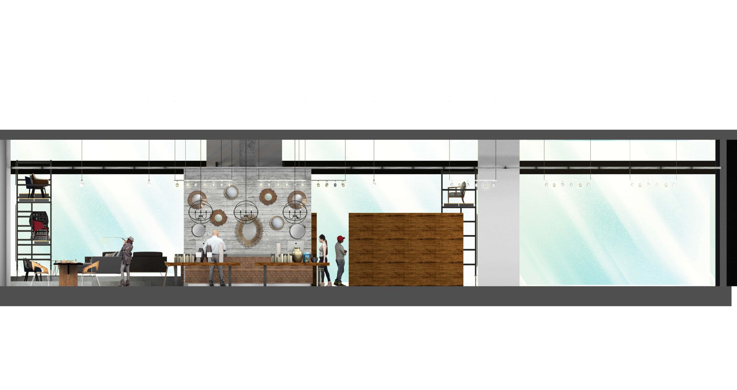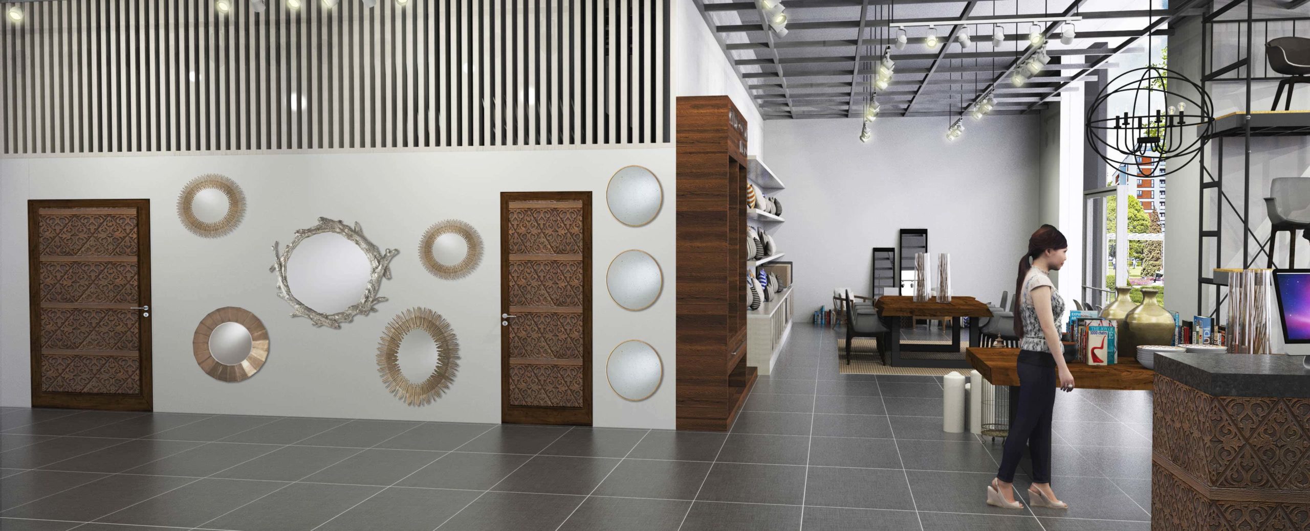 Designed as a modern interior design showroom in Munich, this project explored openness, structure, and spatial rhythm. The intention was to create a flexible commercial environment that could showcase furniture, textiles, and curated objects within a clean architectural framework.